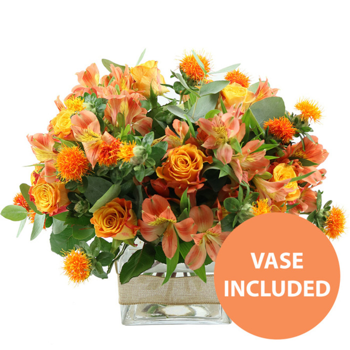Celebrate the warmth and glow of the harvest season with our Harvest Glow Autumn Bouquet. This beautifully crafted arrangement features a vibrant mix of orange roses, alstroemeria, carthamus, and eucalyptus, creating a unique and stunning visual display.