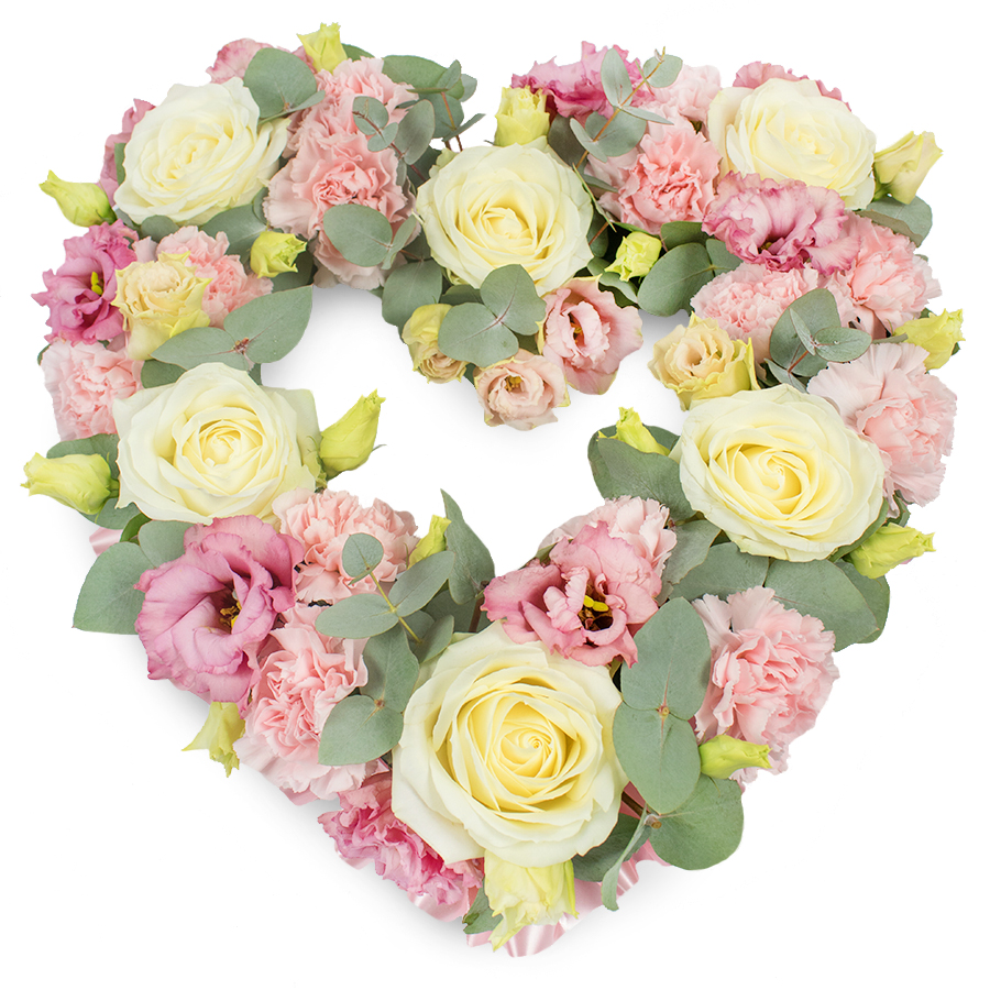 Show your appreciation with our exquisite heart-shaped floral arrangement. This luxurious bouquet features hand-picked white roses, soft pink carnations, elegant pink lisianthus, and fresh eucalyptus leaves, thoughtfully arranged to create a stunning tribute.